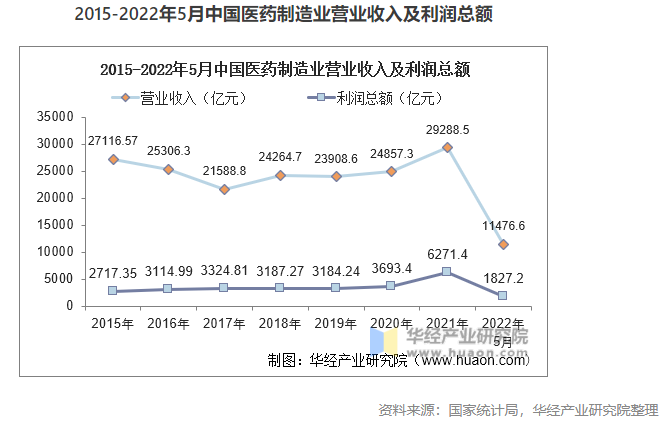 2016年,医药制造业由于受到一系列政策调控和企业转型的影响,药品价格受到严格监管和控制,行业整体营业收入出现下滑,随后市场竞争环境改善,营业收入逐渐恢复增长趋势,2021年中国医药制造业的营业收入为29288.5亿元,利润总额为6271.4亿元,利润率为21.4%,截至2022年5月,我国医药制造业2022年利润率为15.9%。