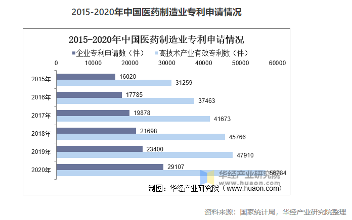 作为技术含量最高的行业之一,医药制造业必须不断投入新药品的研发,提升行业整体创新能力和研发水平,才能提高医药制造业的竞争力。根据国家统计局数据显示2020年我国医药制造业企业专利申请数为29107个,高技术产业专利有效数56784件,同比增长18.7%