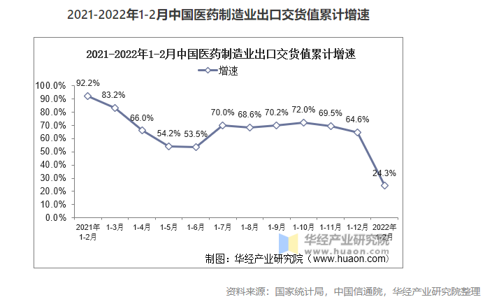 出口交货值保持较快增长态势。受海外疫情持续爆发影响,防疫物资产品出口需求强劲,支撑医药制造业出口保持较快增长。截至2022年1-2月,医药制造业出口交货值同比增长24.3%,在去年高基数的情况下继续保持高速增长,较工业平均水平高7.4个百分点