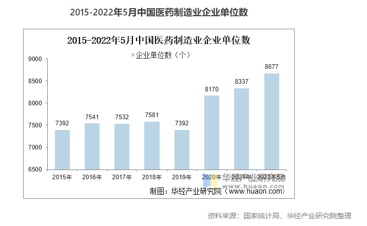 疫情前,受政策控制和行业严格监管的影响,我国医药制造业企业单位数量较为稳定,研发能力较弱的中小型企业逐渐退出市场,2020年疫情席卷全球,市场迫切需要大量药品和疫苗研发,企业数量开始增长,截止2022年5月我国医药制造业企业有8677家。