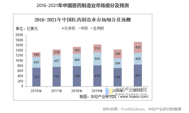 医药制造业三大种类中,化学药的市场占比最多,化学药主要用于人体疾病防治、诊断。应用领域较为广泛和普及,2020年我国化学药市场规模大709亿美元,占比49.2%;生物药凭借其药理活性高、特异性强、治疗效果好等特点,越来越受市场关注,其市场规模由2016年的184亿美元增长至2020年的349亿美元。慢性病的治疗周期较长,我国中药在慢性病的治疗中具有不可替代的作用,2021年我国中药制造企业规模预计为458亿美元。
