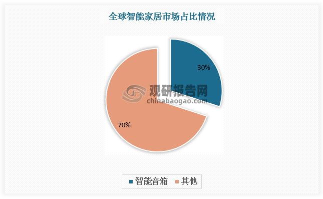 智能音箱是传统有源音箱智能化升级的产物,是指具备智能语音交互系统、可接入内容服务以及互联网服务,同时可关联更多设备、实现对场景化智能家居控制的智能终端产品。智能音箱集成了人工智能处理能力,可以点播歌曲、上网购物、了解天气预报,也可以对智能家居设备进行控制,比如打开窗帘、设置冰箱温度、提前让热水器升温等,深受家庭消费者欢迎。近几年智能音箱已经成为智能家居主流产品,基本维持在30%左右的份额。