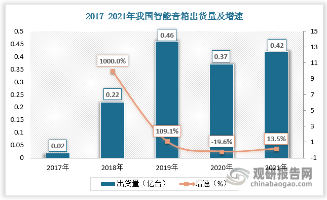 数据显示,2019年我国智能音箱出货量达0.46亿台,较上年同比增长109.1%;2020年受疫情影响以及厂商价格补贴力度的减小,我国智能音箱出货量有所下降,为0.37亿台,增速为-19.6%;2021年随着疫情向好以及市场受到智能家居设备使用增加的推动,国内智能音箱出货量回升,约为0.42亿台,增速为13.5%。