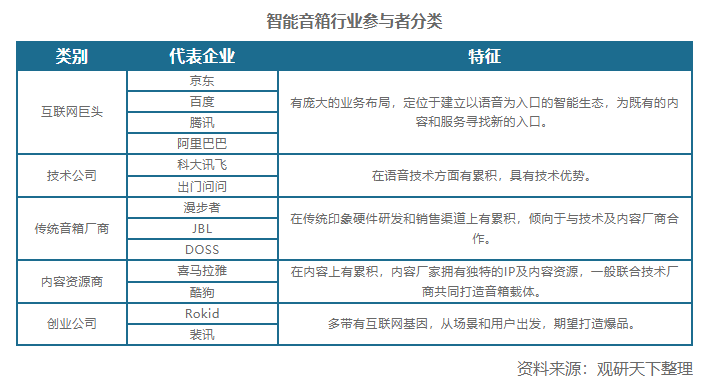 2011年美国亚马逊开始了智能音箱的研发,并于2014年发布了Echo智能音箱,由此智能音箱行业起步发展。随后谷歌、苹果等相继发布智能音箱产品,行业进入爆发式增长阶段。2015年京东联合科大讯飞推出的叮咚智能音箱则是国内智能音箱行业的先行者,此后随着行业向好,参与者不断增多,主要分为互联网巨头、技术公司、传统音箱厂商、内容资源商、创业公司五大类。