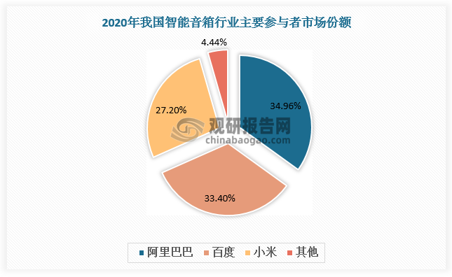 从市场集中度来看,我国智能音箱行业集中度高,且呈现不断加强趋势。数据显示,2019-2020年我国智能音箱市场CR3由92.7%上升至95.6%。从竞争格局看,智能音箱市场呈现阿里巴巴、百度、小米三足鼎立市场格局,2020年市场份额分别为34.96%、33.4%、27.2%。