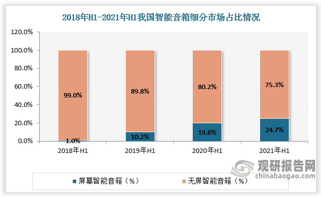 从细分市场看,智能音箱分为屏幕音箱和无屏音箱,近年来随着智能音箱技术水平提升,产品智能程度提高,屏幕音箱占比逐渐提升,2021年H1达24.7%,较2018年H1增长23.7个百分点。