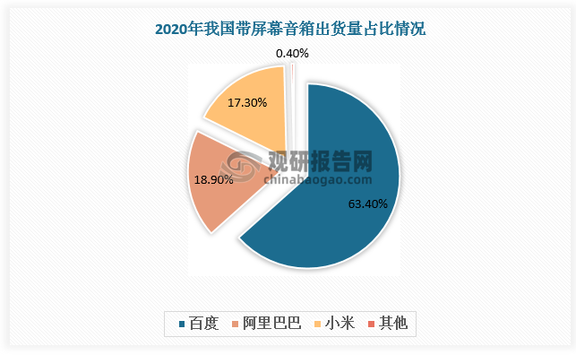 带屏幕音箱市场中,百度凭借优越的人工智能语音技术,出货量占比最大,2020年为63.4%;其次是阿里巴巴和小米,带屏幕音箱出货量占比18.9%、17.3%。