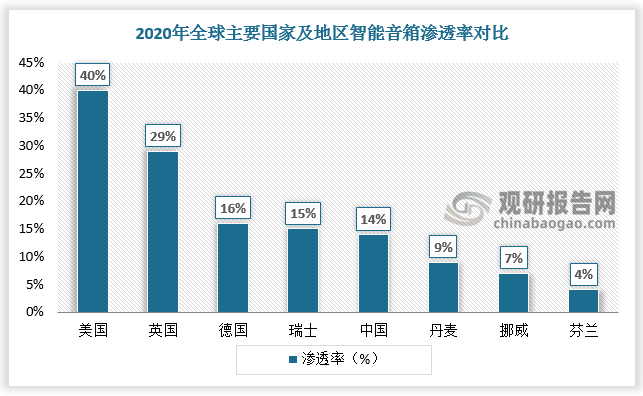 2017-2020年,国内智能音箱市场零售额由4.9亿元增长至74亿元,2021年H1我国智能音箱行业市场规模达46.5亿元,较上年同期增长30.6%,我国智能音箱进入迅猛增长阶段。但从渗透率来看,2020我国智能音箱渗透率(14%)排名全球第五,销售规模仍有较大的提升空间。未来,随着智能音箱厂商向下沉市场拓展,预计2023年我国智能音箱销售额达到174.2亿元。