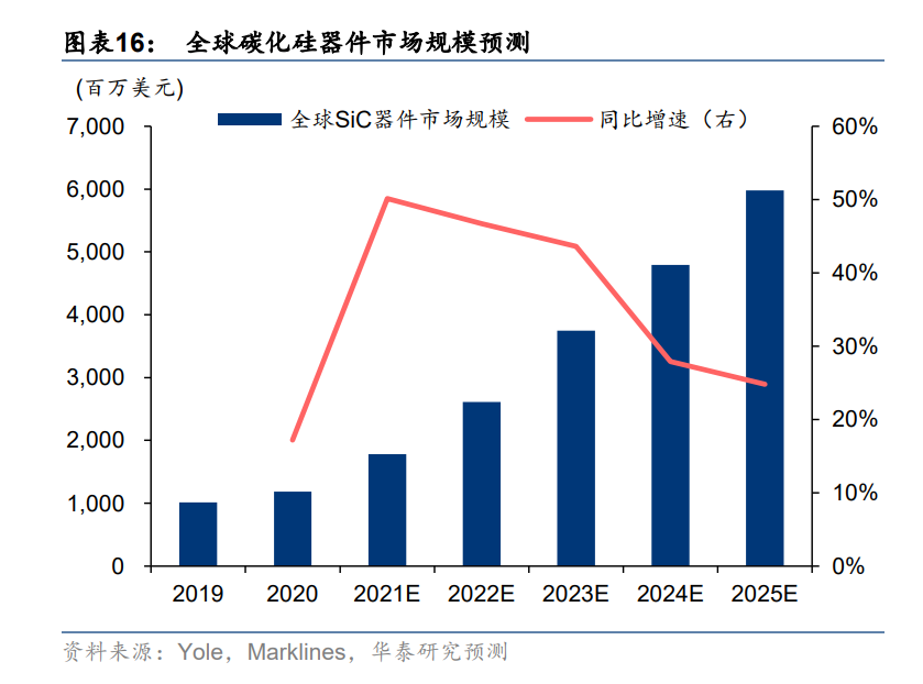 2020 年全球 SiC 器件市场规模达 11.84 亿美元,预计到 2025 年有望增长至 59.79 亿美元,对应复合年均增长率为 38.2%。根据测算,在碳中和趋势下,受益于 SiC 在新能源汽车、光 伏、风电、工控等领域的持续渗透,SiC 功率器件市场规模有望从 2020 年的 2.92 亿美元增长至 2025 年的 38.58 亿美元,对应复合年均增长率为 67.6%;以及在5G通信、下游SiC功率及射频器件高速增长的需求也将带动 SiC 材料市场规模快速成长。