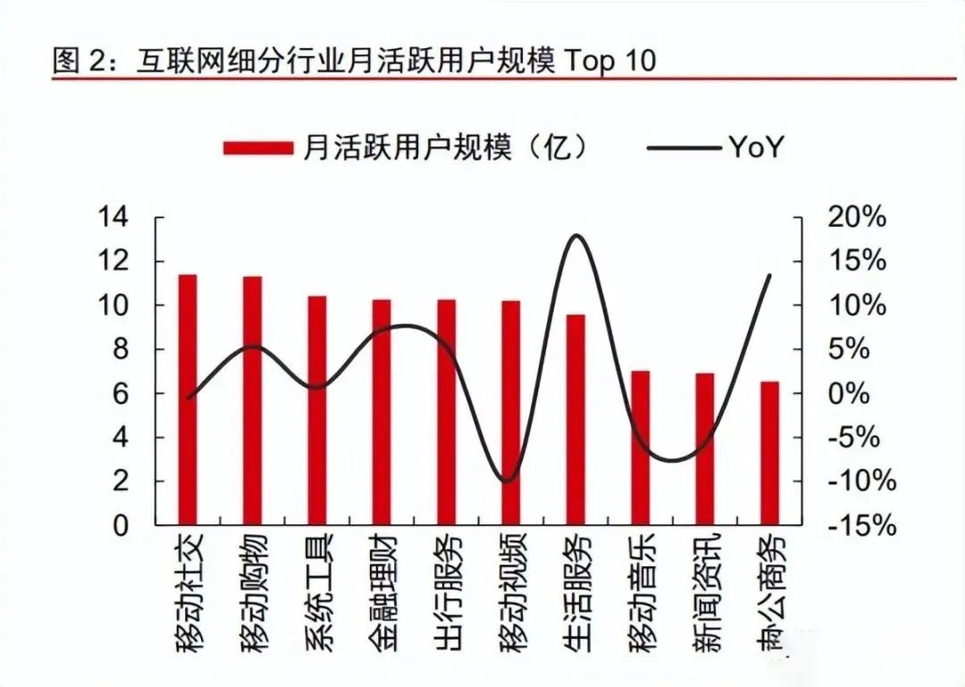 国内互联网渗透率已达较高水平,流量红利基本见顶。根据 Questmobile,截至 2022 年 12 月,中国移动互联网月活跃用户规模达到 12.03 亿,根据第七次人口普查数据,我国 10-79 岁人口约 12.09 亿,互联网用户渗透率已达较高水平。2022 年 6 月,移动社交/ 移动购物/系统工 App MAU 分别达 11.43/11.36/10.45 亿(Questmobile),腾讯系/头条系/阿里系/百度系 App 渗透率分别达98.6%/89.5%/96.2%/91.8%(月狐数据),头部平台渗透率接近天花板,流量红利基本见顶。