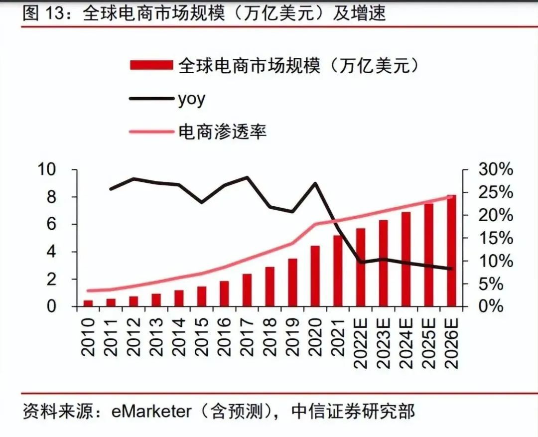 疫后消费线上化趋势延续,2026 年全球电商渗透率有望达 24%。疫情加速培育全球用户电商消费习惯,根据 eMarketer,全球电商市场规模 2019-2021 年 CAGR 为 22%。尽管全球疫情已进入常态化防控阶段,但消费者线上购物的习惯仍然得以保持,根据相关数据显示,疫情后依然会偏好线上购物的用户数在不同品类提升 5%-15%。消费线上化趋势下,根据 eMarketer,预计 2026 年全球电商市场规模有望达 8.1 万亿美元,2022-2026 年 CAGR 为 9%,2026 年全球电商渗透率有望达 24%。