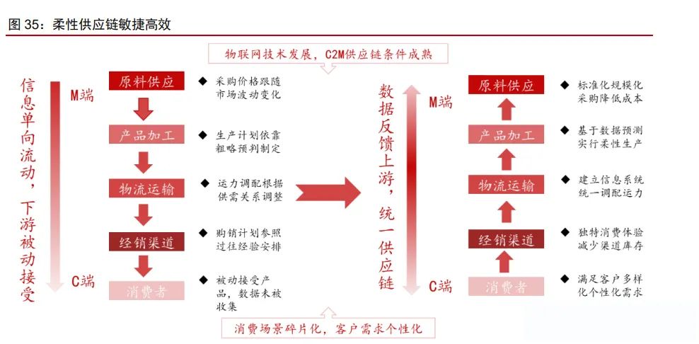 柔性供应链高度敏捷,更快捕捉趋势性机会。中国供应链高度灵活敏捷,对传统供应 链的数字化赋能、消费者数据的沉淀以及逆向反馈使得工厂具有按需生产的能力,大幅降 低商家库存和成本压力,“小单快反”的模式也能帮助商家更快地捕捉趋势性机会。以柔性供应链的极致践行者 Shein 为例,根据 Zara 财报及晚点 LatePost,Shein 从收到订单 到产品出厂/库存周转天数只需 5/30 天,生产及周转效率明显高于 Zara、H&M,而生产成 本仅为 Zara 的 30%-50%。