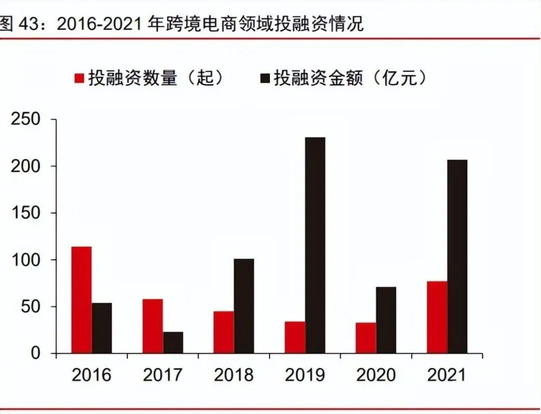 服务生态完备,全链路赋能跨境卖家。随着跨境电商行业整体成熟度和专业度的提升, 以及行业竞争的加剧,对卖家的综合运营能力提出了更高的要求,跨境支付、代运营、营销推广等跨境电商服务商应运而生。根据艾瑞咨询,2021 年跨境电商领域投融资总金额 达 207 亿元,其中服务商领域融资事件/规模占比分别为 65%/34.5%。跨境电商服务商生态的繁荣,有助于增强跨境卖家面向海外市场的竞争力。