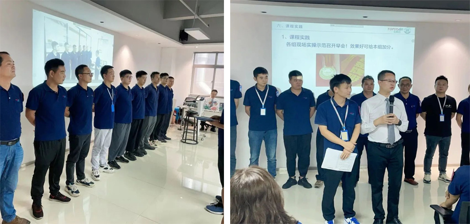 本次项目制系列课主要包括《金牌班组之标准作业》《金牌班组之动作经济原则》《金牌班组之高效高质量早会》等十多节课程,为确保培训内容的有效落地,此次培训采用半天培训+半天辅导的形式,全面提升一线班组长能力,打造金牌班组长。培训开始之前首先进行了开营仪式,营造浓厚学习氛围,明确学习目标。