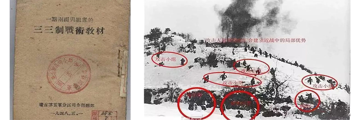 三三制战术较早起源于抗日战争期间,成熟于国共内战,大量运用于抗美援朝战争,是我军步兵训练大纲中的一种步兵“班组突击”战术。在抗美援朝期间,凭借着这种战术,我志愿军战士,在抗美援朝的战场上,将装备精良且人数众多的联合国军打得晕头转向,甚至多次进攻至美军的核心阵地。也是运用三三制战术,志愿军还将英国特遣队全数歼灭,另外在对印的作战中,三名志愿军战士利用三三制战术,大胆纵深敌阵近十公里,连夺多个印军炮兵阵地。类似的例子很多。