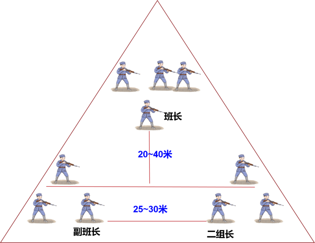 抗日战争时期,我军由于装备上的匮乏,不如日方装备精良,作战时,不得不常以密集队形冲击日军的坚固阵地。按照当时的布置,三人为一个战斗小组。在三人作战小组中,这三个战士分工十分明确,一个是进攻,一个进行掩护,一个则在进行支援,而三个战斗小组就组成一个战斗班,三个战斗班则组成一个战斗群这种冲锋方式。这样的队形可以把落后的装备,形成大的战斗力,同时营造一种四面八方密集冲锋的态势,给敌军造成巨大的心理压力。