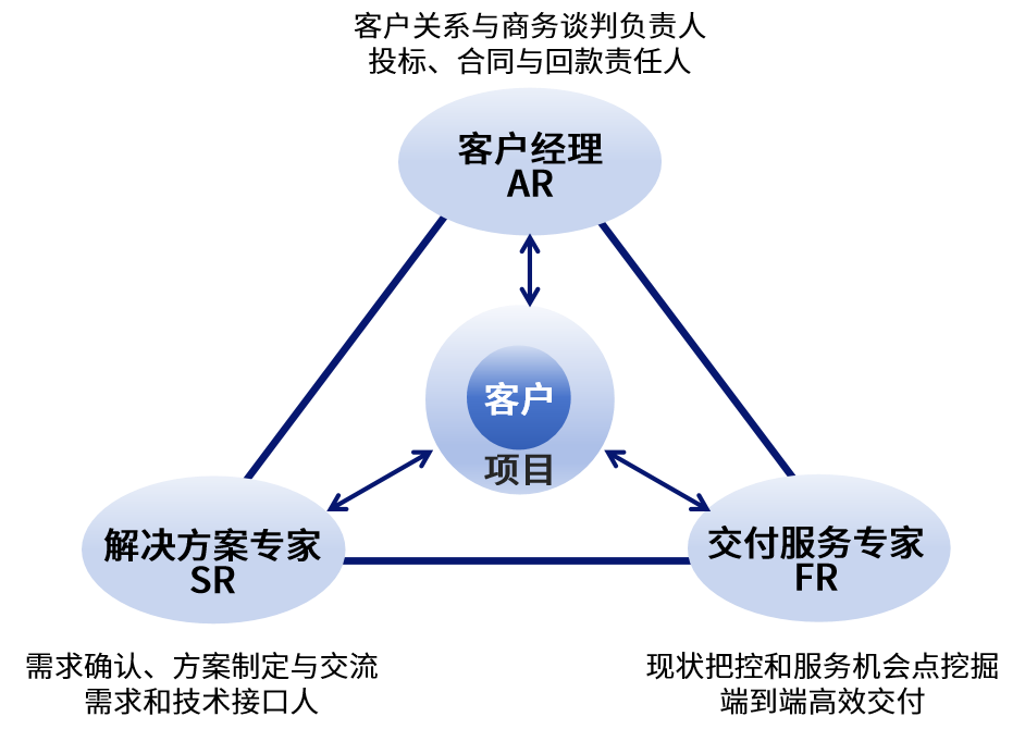 成立面向客户的客户关系、产品和解决方案、交付为核心的铁三角组织
