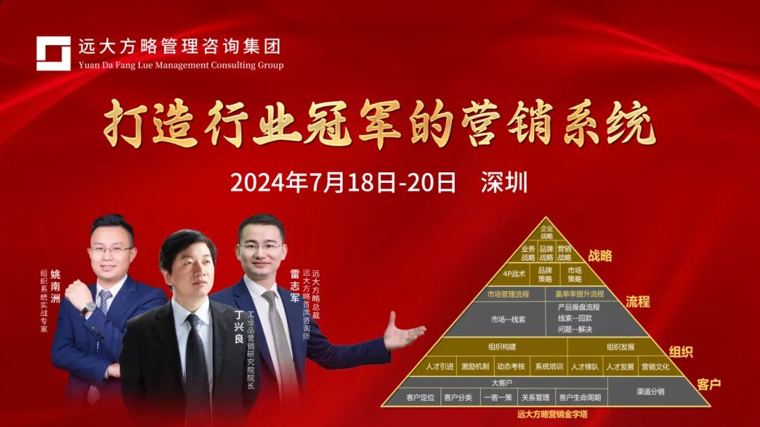 7月18日-20日,远大方略《打造行业冠军的营销系统》,三大实战导师联袂授课,深度剖析成功咨询实战案例,学会一套营销系统打造的系统方法,实现可持续增长。