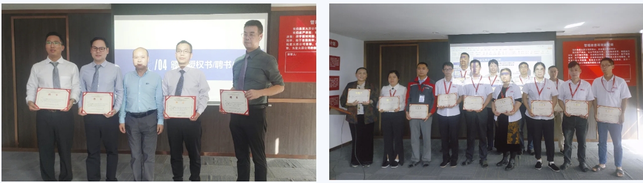 会上,郭总还为项目组颁发聘书和授权书,同时为项目改善小组颁发任命书,明确目标,落实责任。最后,参会全体人员进行宣誓,坚定变革决心,全力推动改善,助力企业高质量发展。