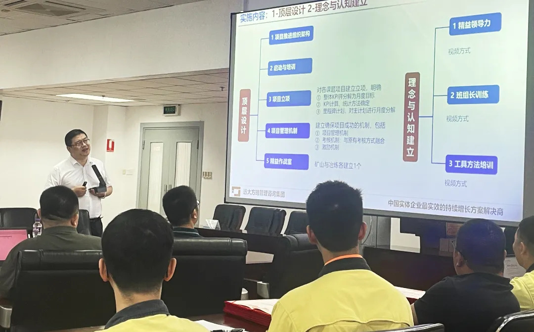 启动会上,项目组老师首先向中冶瑞木对远大方略的信任表示感谢,老师介绍了项目的顶层设计,先对整体框架和关键要素进行明确和规划,主要包括项目推进组织架构,启动与培训,项目立项、项目管理机制以及精益作战室。项目能否成功落地除了框架的建立,理念与认知的建立也是十分重要,要对大家进行相关培训,包括精益领导力、班组长训练以及工具方法培训,提升认知,掌握理论才能更好地落地实践。