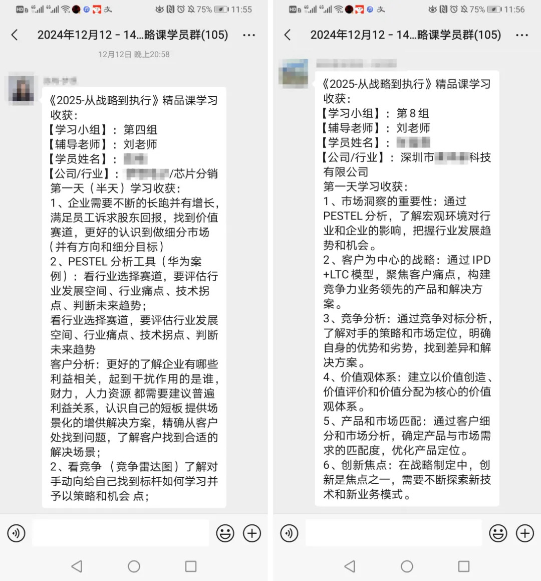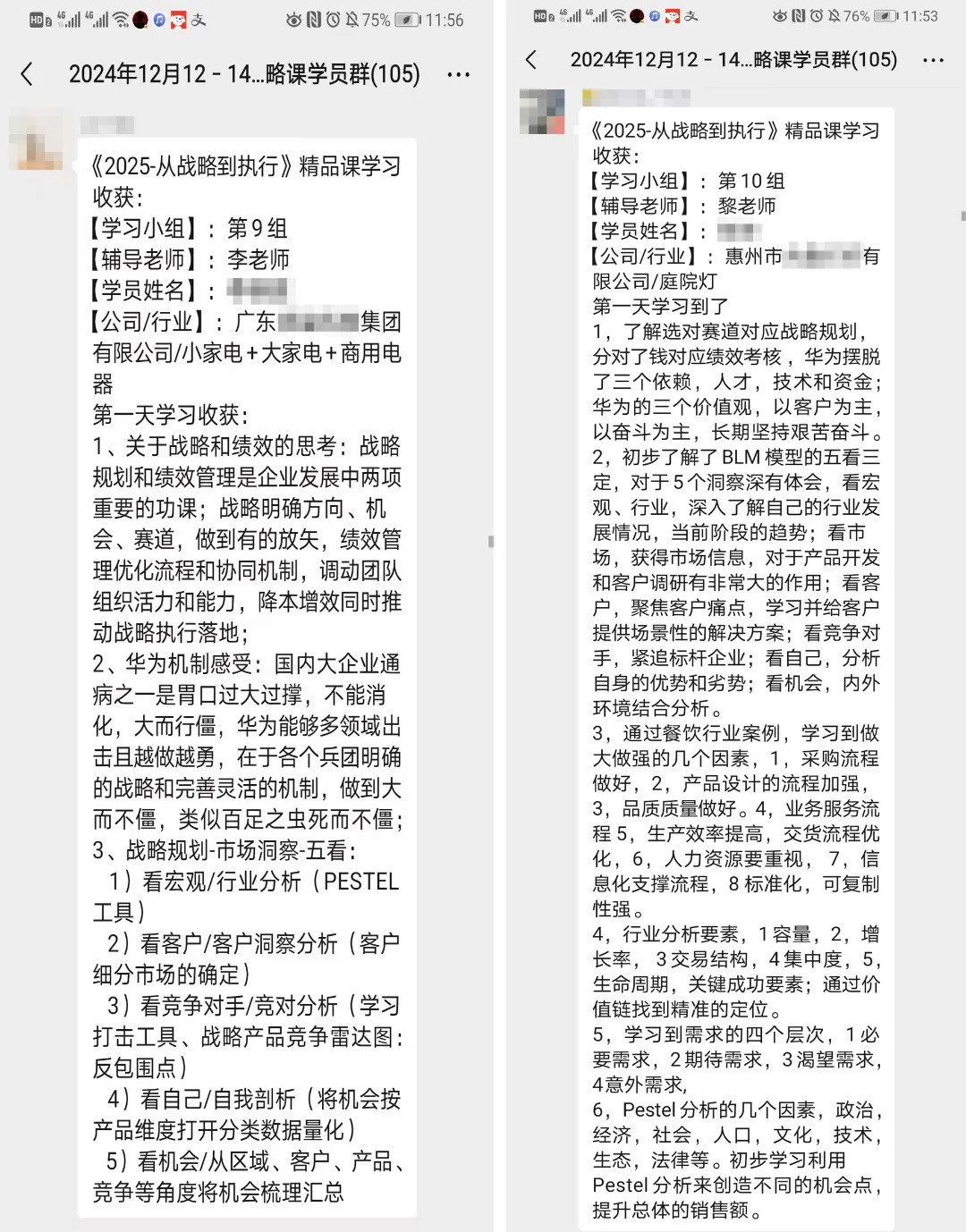 课堂上老师全程高能输出,不仅让学员掌握了丰富的理论知识,还有一套行之有效的工具方法;课上针对性的演练,老师现场辅导答疑解惑,让学员把每一个知识点都落到实处;课上作业分享,课后总结收获,巩固知识要点,让每一位学员回到企业都能够制定一套适合企业的战略方案,真正做到学来即用,落地即见效。