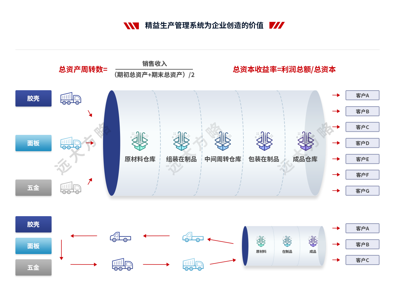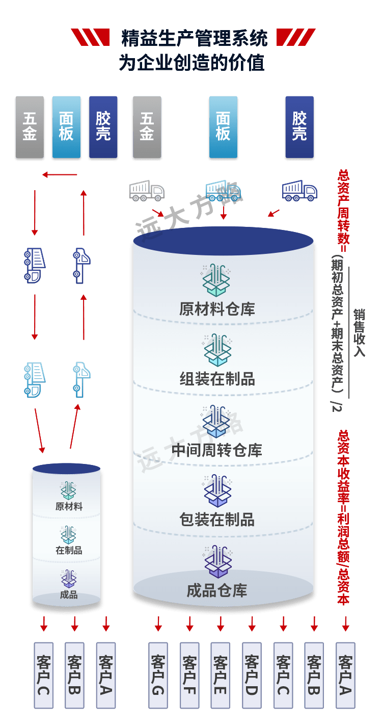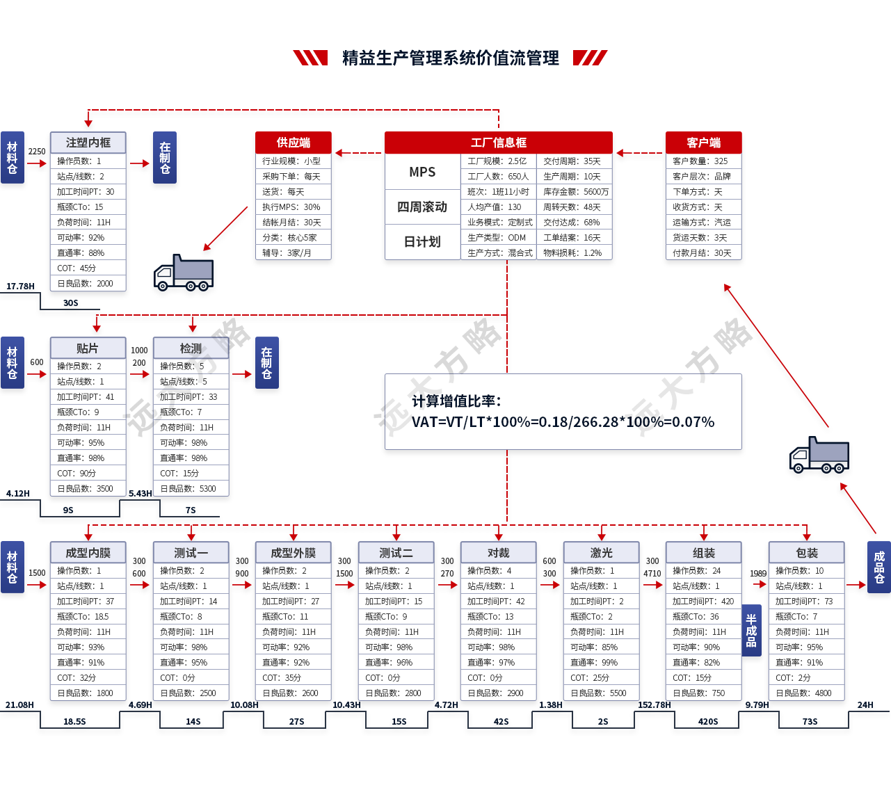 3、数据增长:精益整体成熟度提升33%、订单准交率提升77%、生产周期整体缩短29%、库存容积率提升50%;导入了供应链管理与精益生产模式,在领导理念、教育和培训、客户与流程导向、均衡化和设备管理、目视化管理、职责、品质内建、问题解决、授权员工、持续改善系统等10个方面有突出提升;在流动装配、加工单元、6s与目视化、内部物流、标准作业、精益意识等6个方面变化显著。